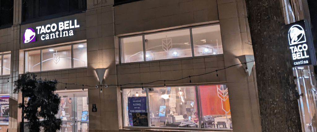 The first thing that struck me about this Taco Bell Cantina was how similar it was to a regular taco bell. In my mind I think I had expected the “lounge” part of the Cantina to be more of a lounge. And less like a couple of low chairs reminiscent of a hospital surgical waiting area. There was really nothing particularly distinguishing about the storefront itself.